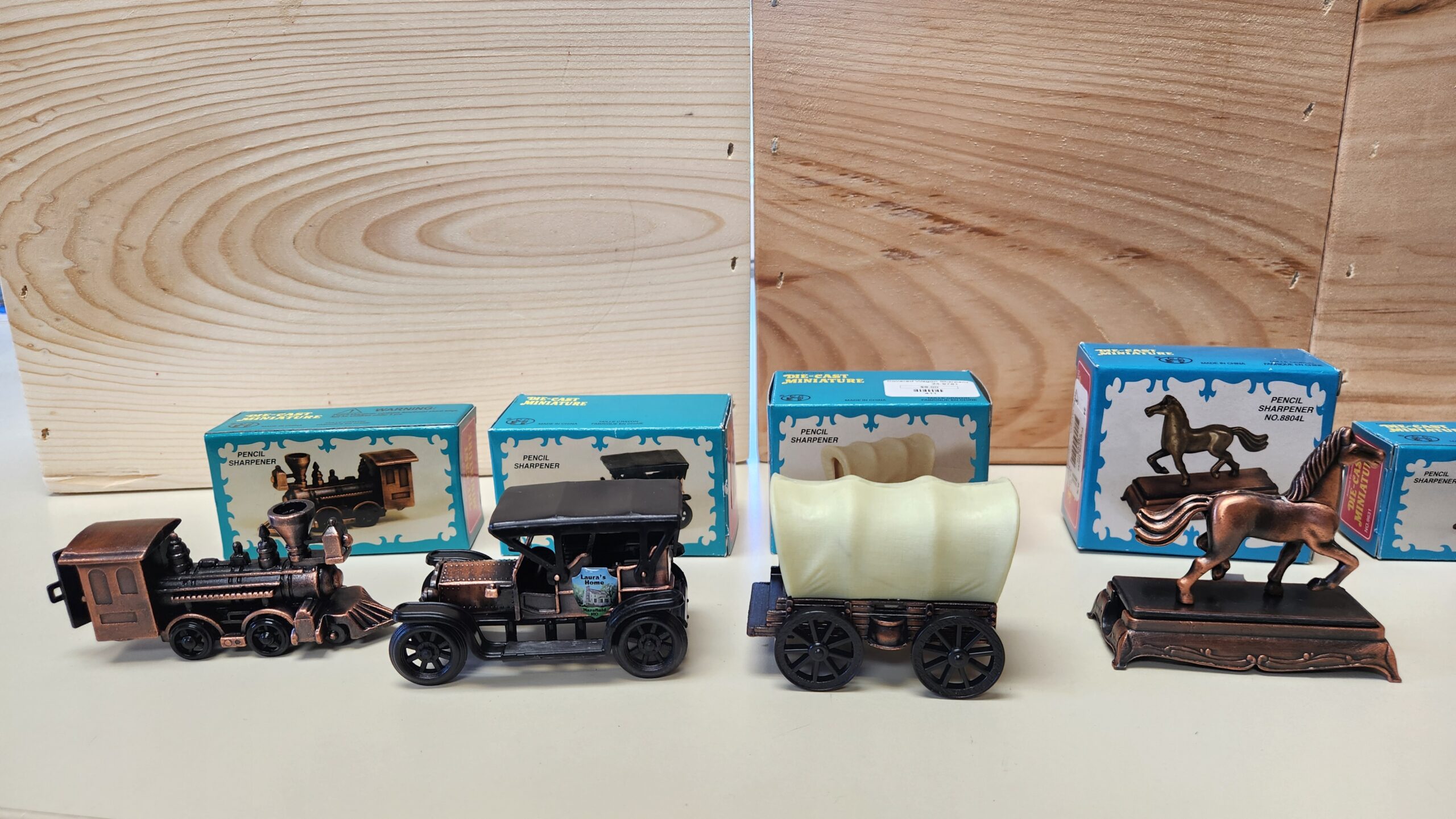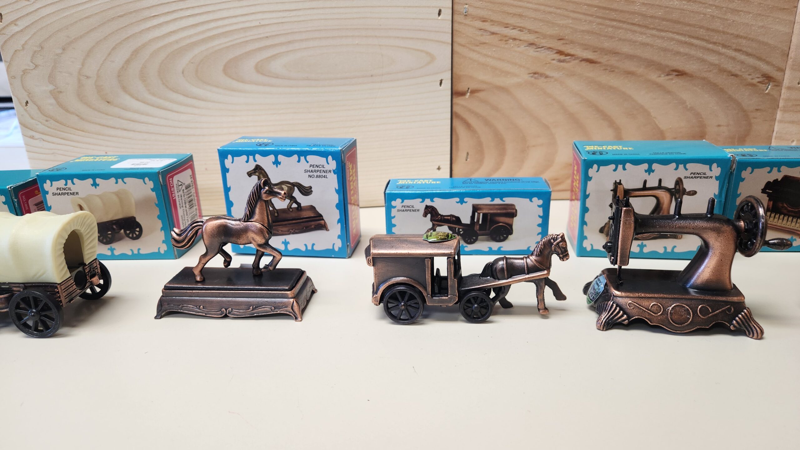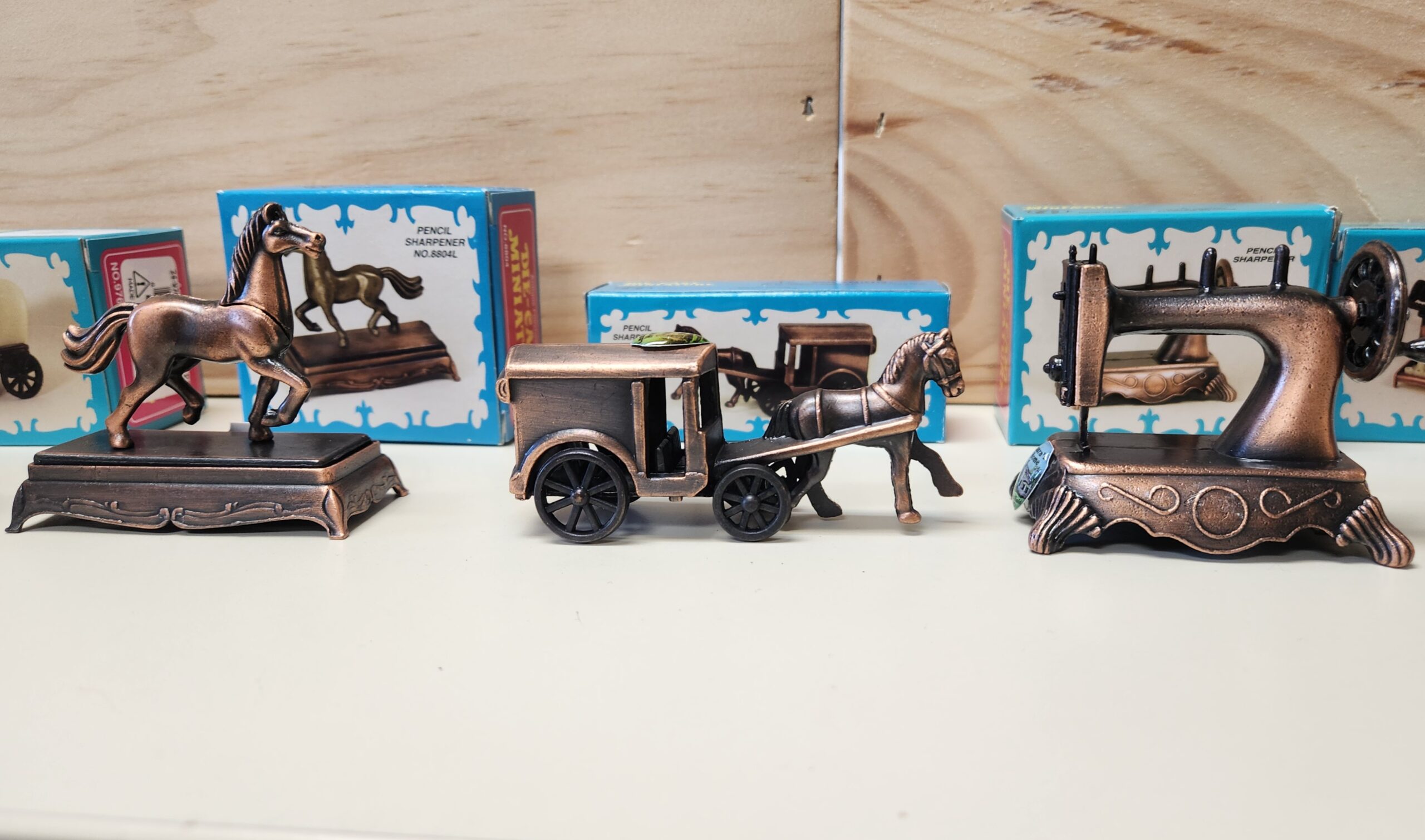 | Pencil Sharpener | Horse & Carriage, Prancing Horse, Covered Wagon, Locomotive, Auto, Sewing Machine, Typewriter, Water Pump, Coffee Grinder, Fiddle |